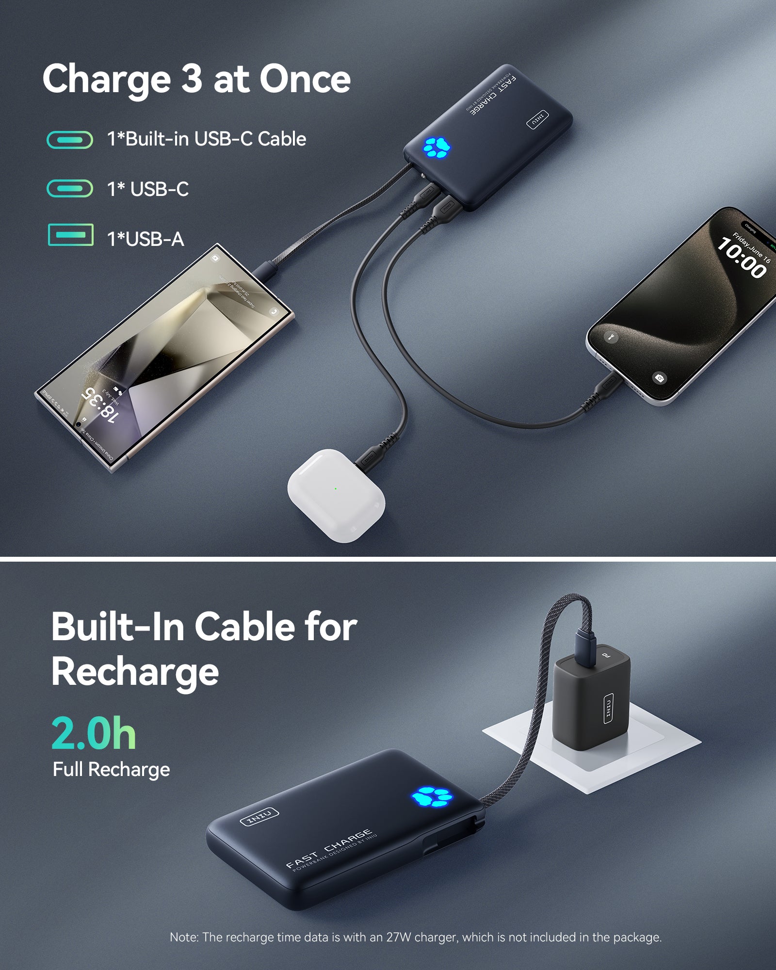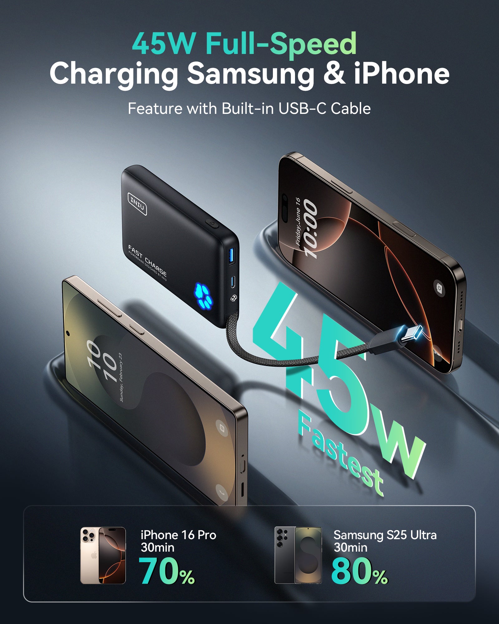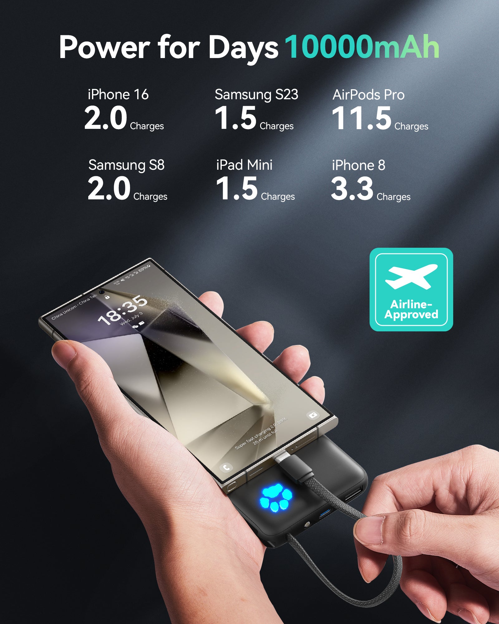 INIU Pawsible P41L-E2 Power Bank mit eingebautem Kabel, schlankeste 45 W, 10.000 mAh