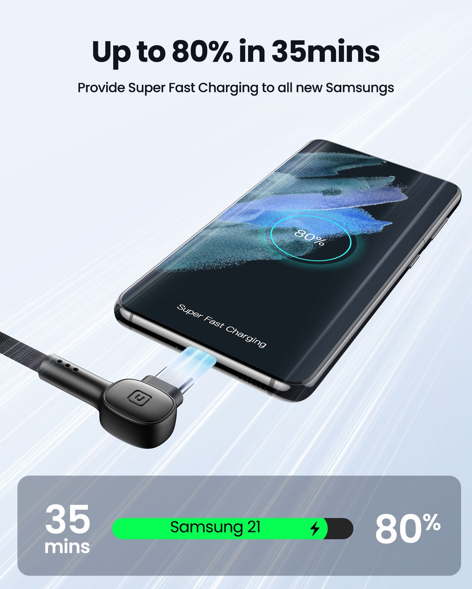 Una corriente máxima de 5 A permite que el cable alimente completamente a Samsung. S21 en solo 75 minutos: le ahorra más de 30 minutos en comparación con las 2 horas de esos 3.1A.
