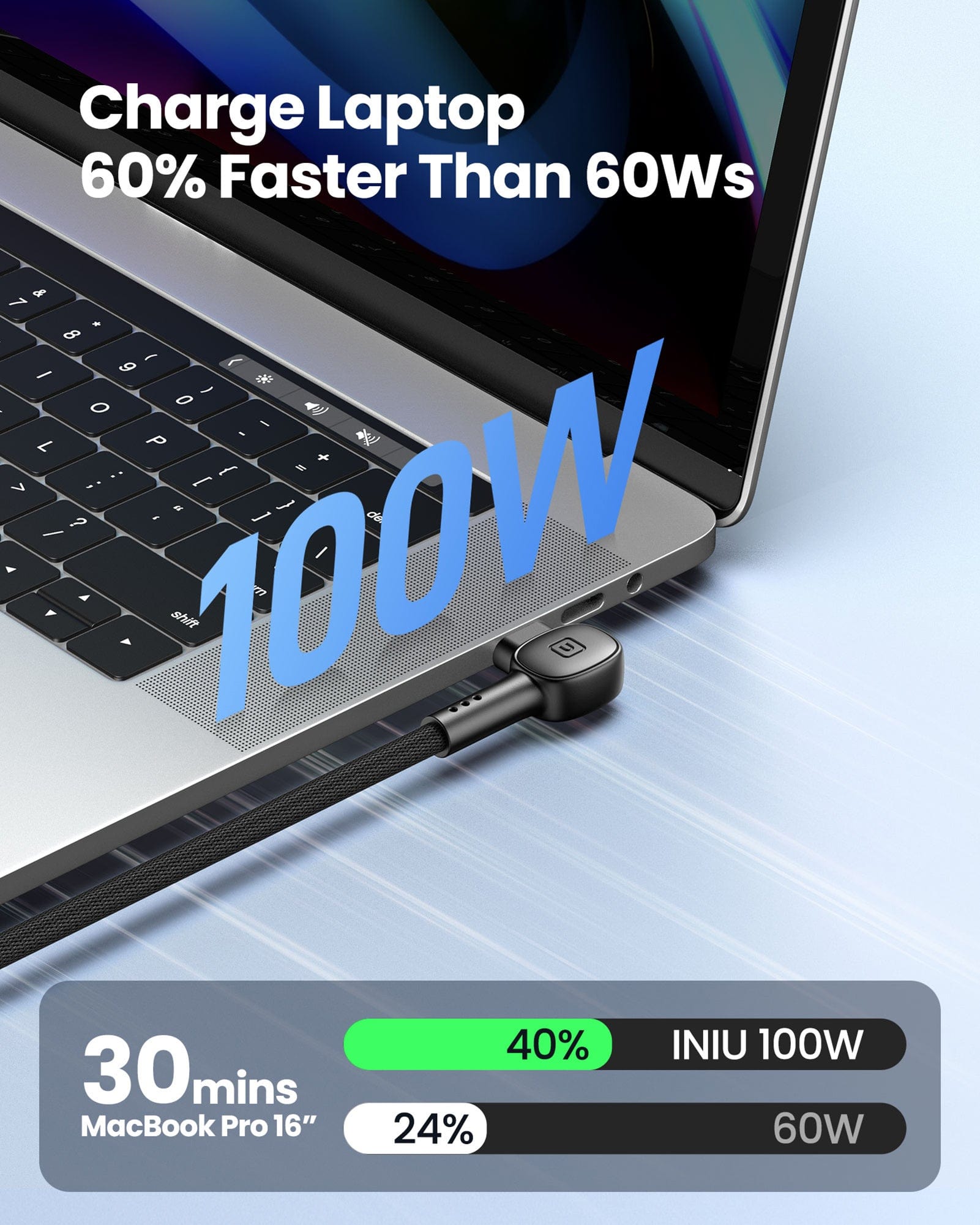 ¿Por qué este cable USB-C a USB-C INIU 100W?✔ Increíblemente, el cable de 100 W máx. alimenta Samsung S✔ Carga rápidamente MacBook Pro de 16'' hasta un 38% en 30 minutos, un 58% más rápido que los 60 W de baja velocidad. ✔ El diseño en ángulo de 90° proporciona una gran comodidad de carga mientras juegas o navegas por sitios web. ✔ Compatible con todos los dispositivos USB-C, desde teléfonos y tabletas hasta computadoras portátiles. ✔ Los materiales de primera calidad crean el cable más duradero hasta la fecha, que dura 10 años.