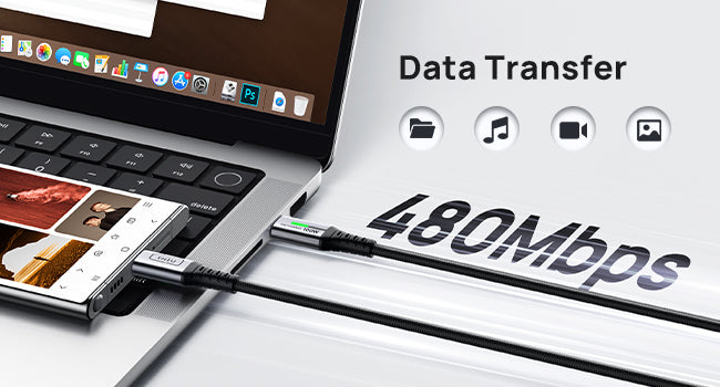 Transfiera sus películas y música favoritas a velocidades de 480 Mbps. (Este es un cable de carga USB 2.0 USB-C a USB-C, no es compatible con Thunderbolt ni salida de video).