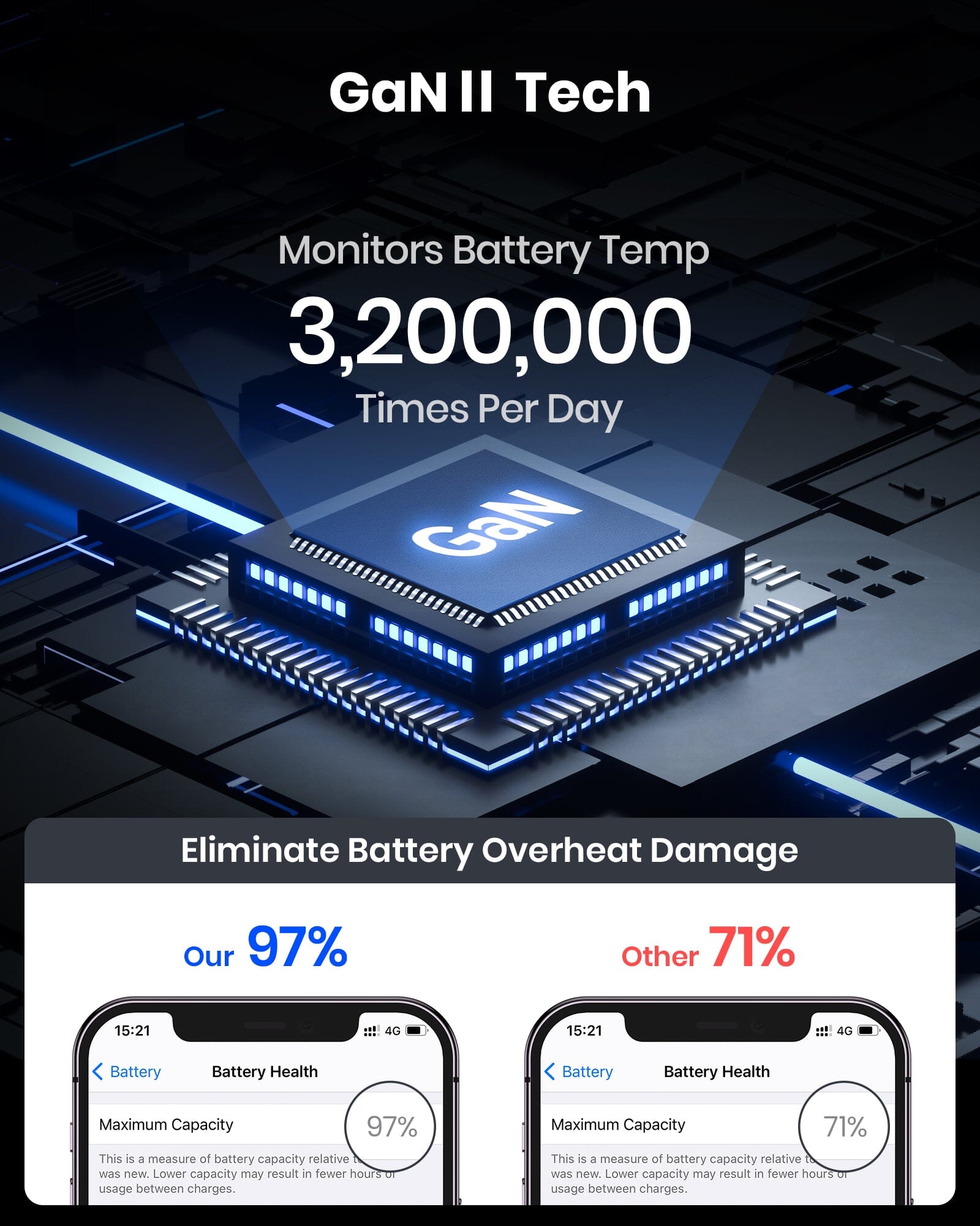 La tecnología GaNⅡ patentada de INIU lo protege a usted y a sus dispositivos al monitorear de manera inteligente la temperatura más de 3,2 millones de veces al día, lo que lo salva a usted y a sus dispositivos de la amenaza de incendio y daños a la batería.