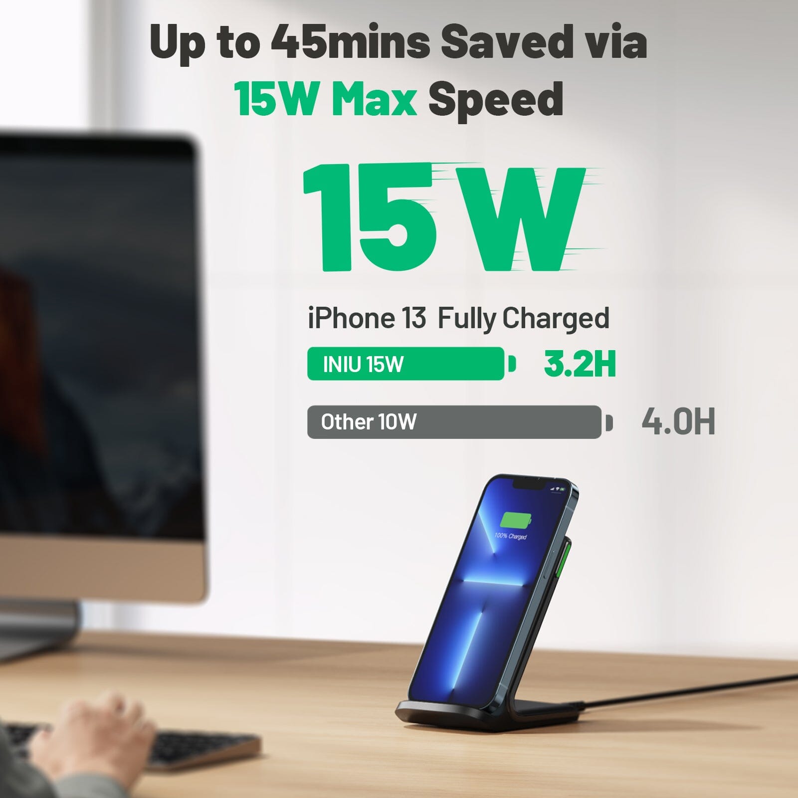 Caricabatterie wireless certificato INIU I211 15W Qi con luce adattiva per dormire