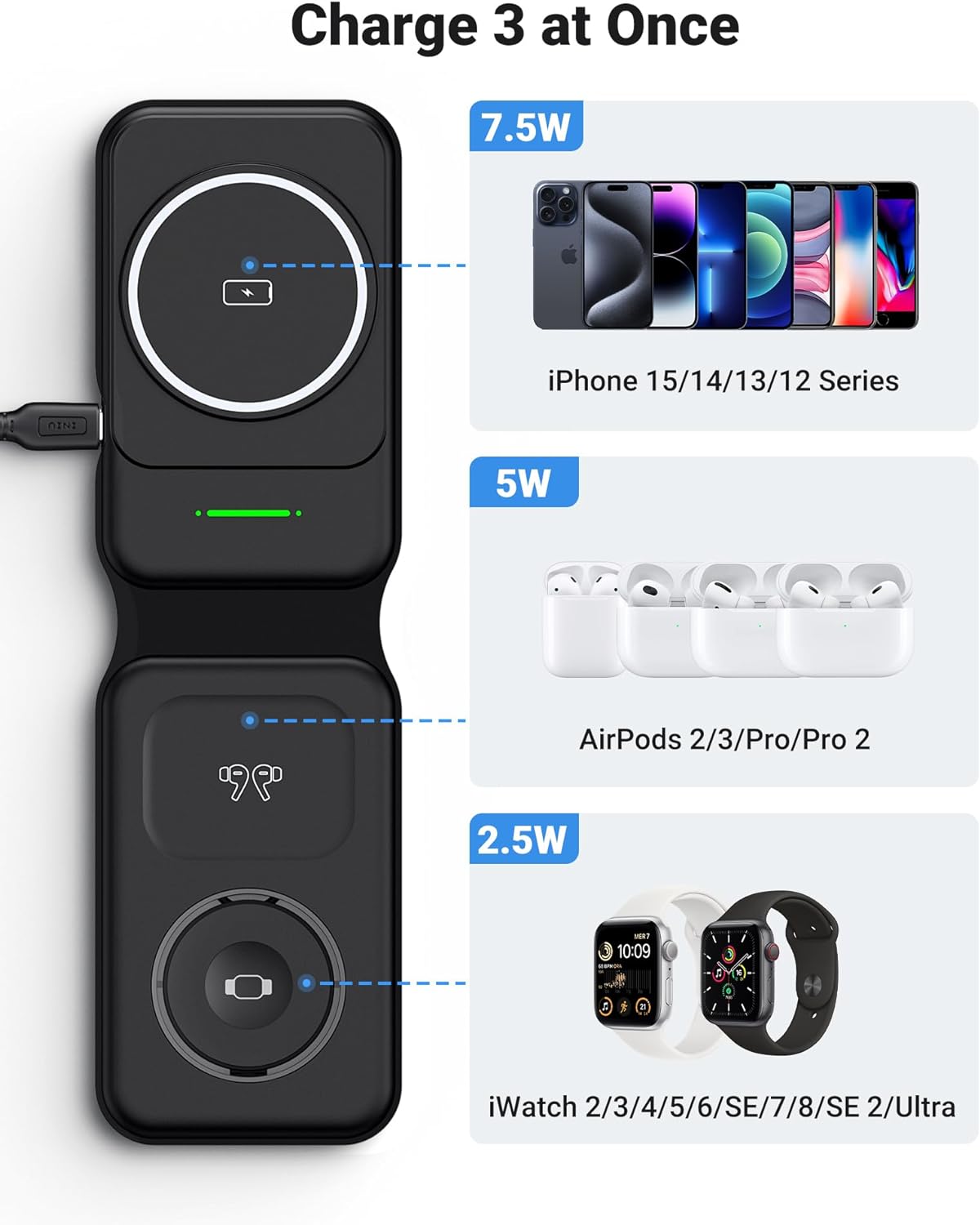 Caricatore Wireless InIU Magnetico Pieghevole 3 in 1 Compatibile MagSafe per iPhone 15/14/13/12 Serie, Apple Watch, AirPods (con Cavo C-C USB da 60W e Adattatore PD 20W)