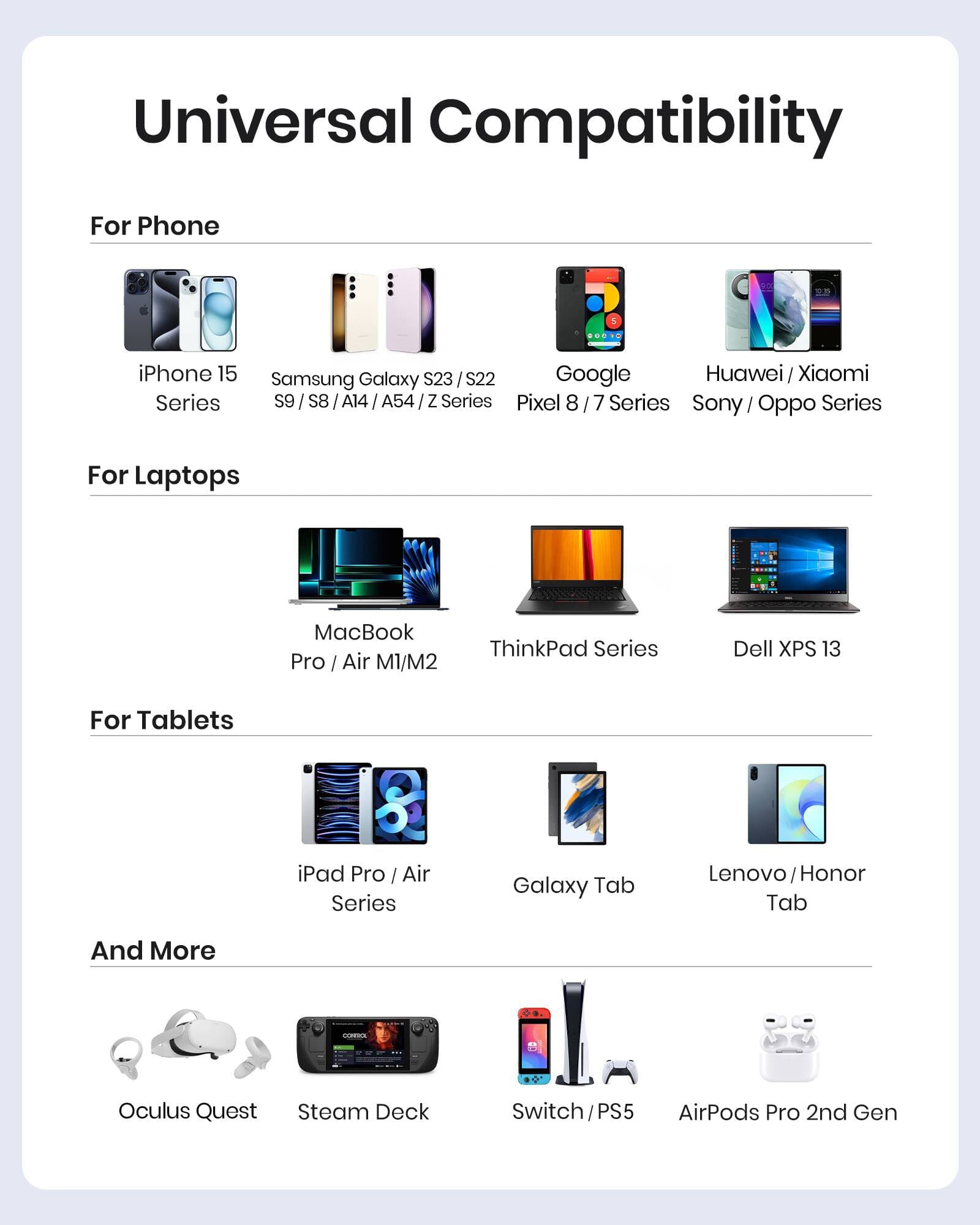2. Uw apparaat ondersteunt snelladen. Volle snelheid: MacBook Air/Pro 14"/15,4"/13,3'', Dell XPS 13, Lenovo ThinkPad X1, HP Spectre, iPad Pro/Air/mini, Samsung S9-S23/Notitie 8-10,Pixel 3-7,Switch/SteamDeck; Beperkte snelheid: MacBook Pro 16"2021, Dell XPS 15