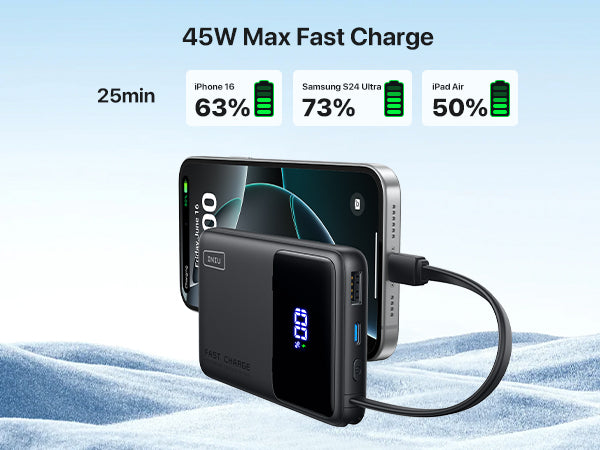 - [45W Full-Speed Opladen Nieuwste iPhone 16 & Samsung S24] Deze powerbank levert een uitgangsvermogen tot 45 W en ondersteunt PD, QC en andere snellaadprotocollen. In slechts 25 minuten laadt hij je iPhone op van 16 tot 63% en je Samsung. S24 Ultra met een indrukwekkende 73%.