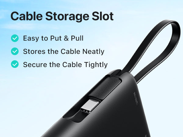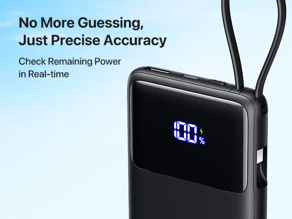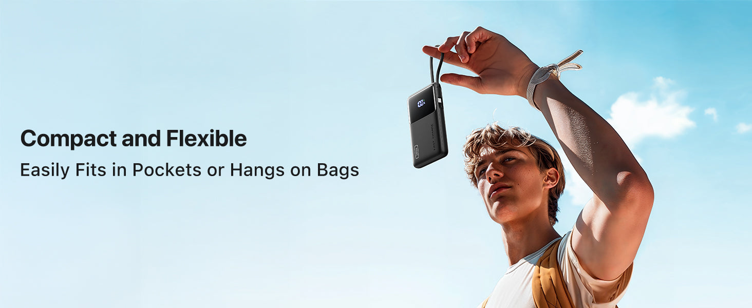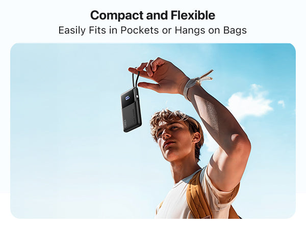 - [Grab & Go, geen extra draden nodig] Met deze 10.000 mAh powerbank met ingebouwde USB-C-kabel kun je de deur uit zonder extra kabels. De kabel laadt zowel je telefoon als de powerbank zelf op en dient tevens als koord om aan je tas te bevestigen.