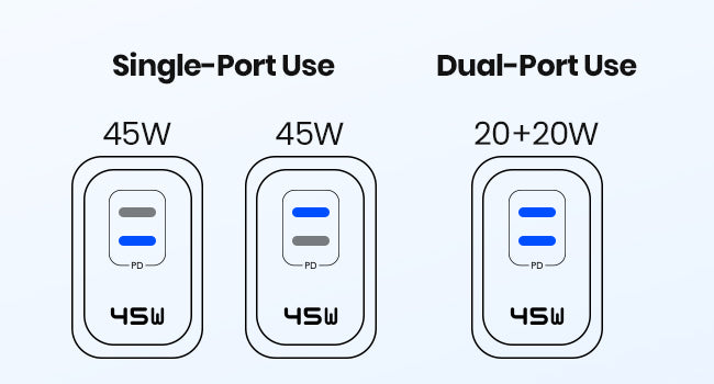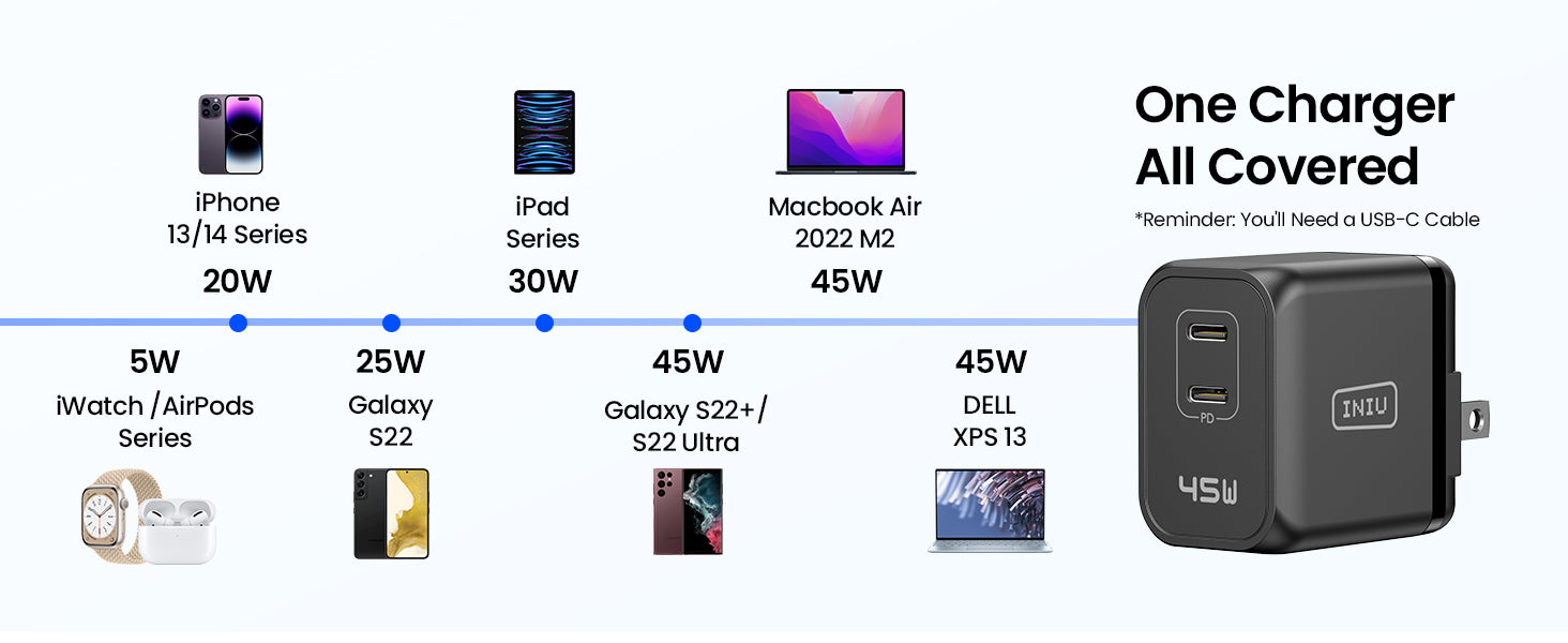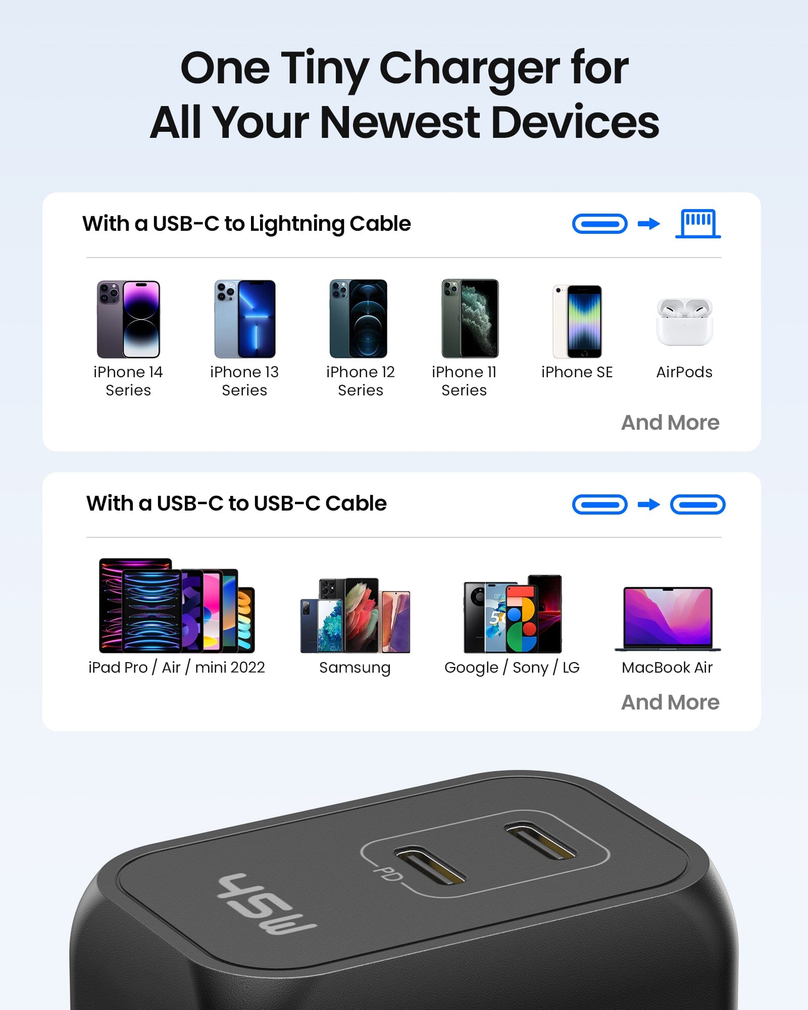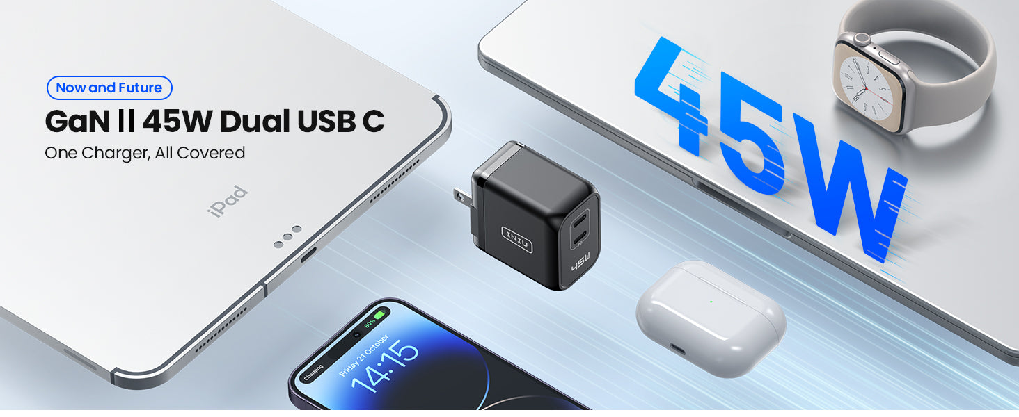 INIU I622 USB C-lader 45W, GaN PD Dual Port Type C-lader, snellaadblok, opvouwbare USB-C-wandlader, stroomadapter