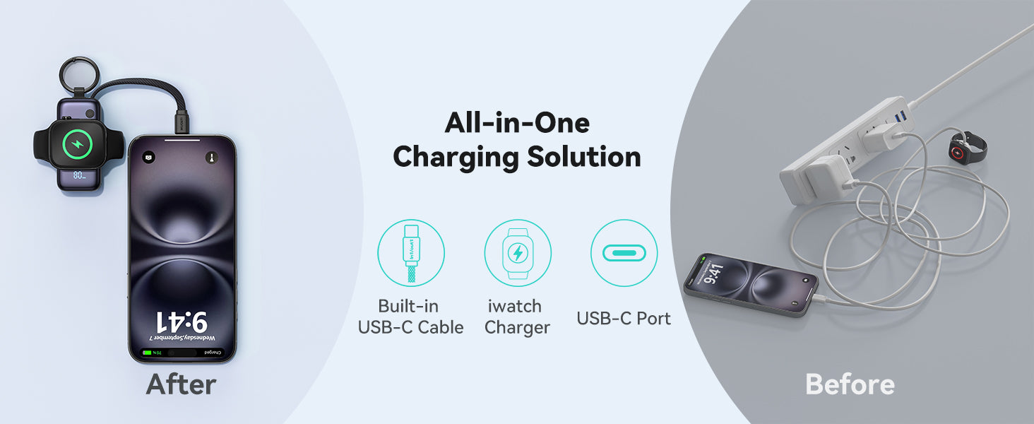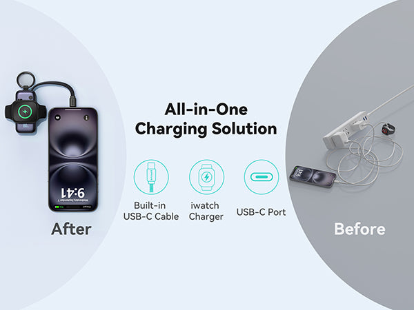 - [Kompaktowe źródło zasilania zapasowego] Ten zatwierdzony przez linie lotnicze powerbank o pojemności 5000 mAh umożliwia do 6 pełnych ładowań Twojego zegarka iWatch S10 lub może naładować iPhone'a 16 do 91%, zapewniając niezawodne zasilanie, gdy najbardziej tego potrzebujesz.