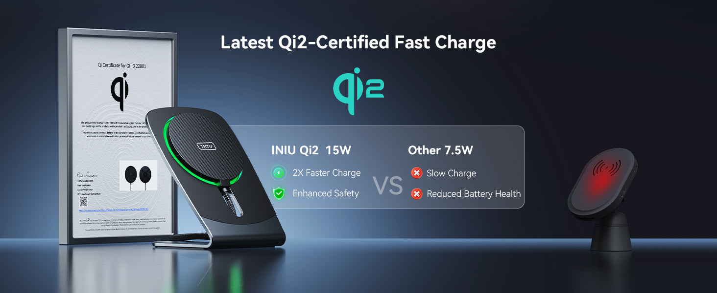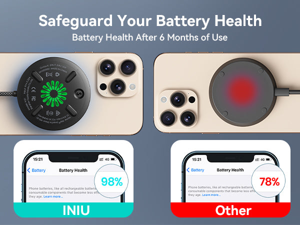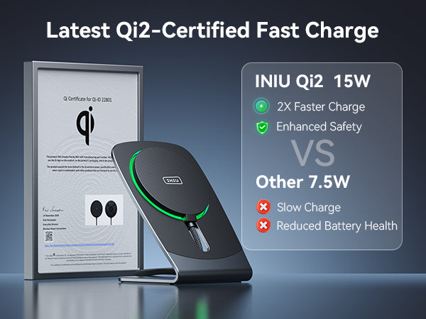 - [Najszybsze bezprzewodowe ładowanie 15 W z certyfikatem Qi2] Rozwiązując problem powolnego ładowania magnetycznego bezprzewodowego w branży, INIU Ładowarka bezprzewodowa ładuje Twojego iPhone'a 16 Pro do 77% w zaledwie 1 godzinę — 2 razy szybciej niż inne ładowarki o mocy 7,5 W.