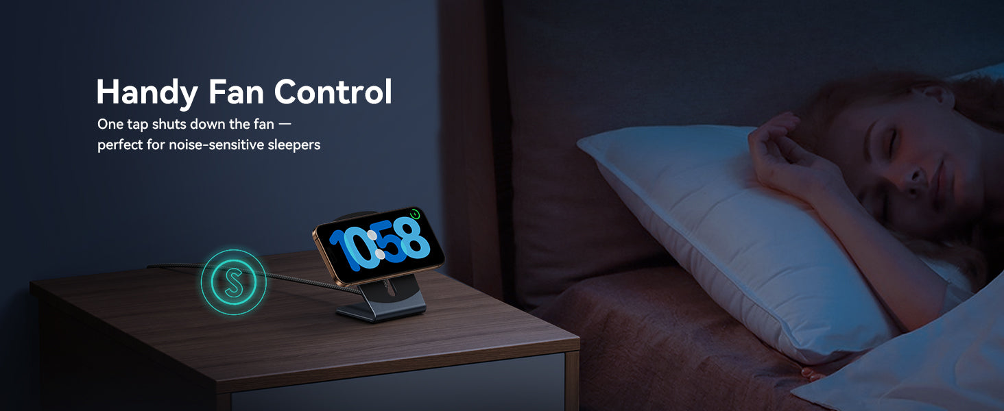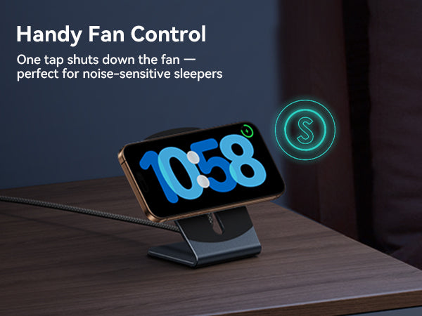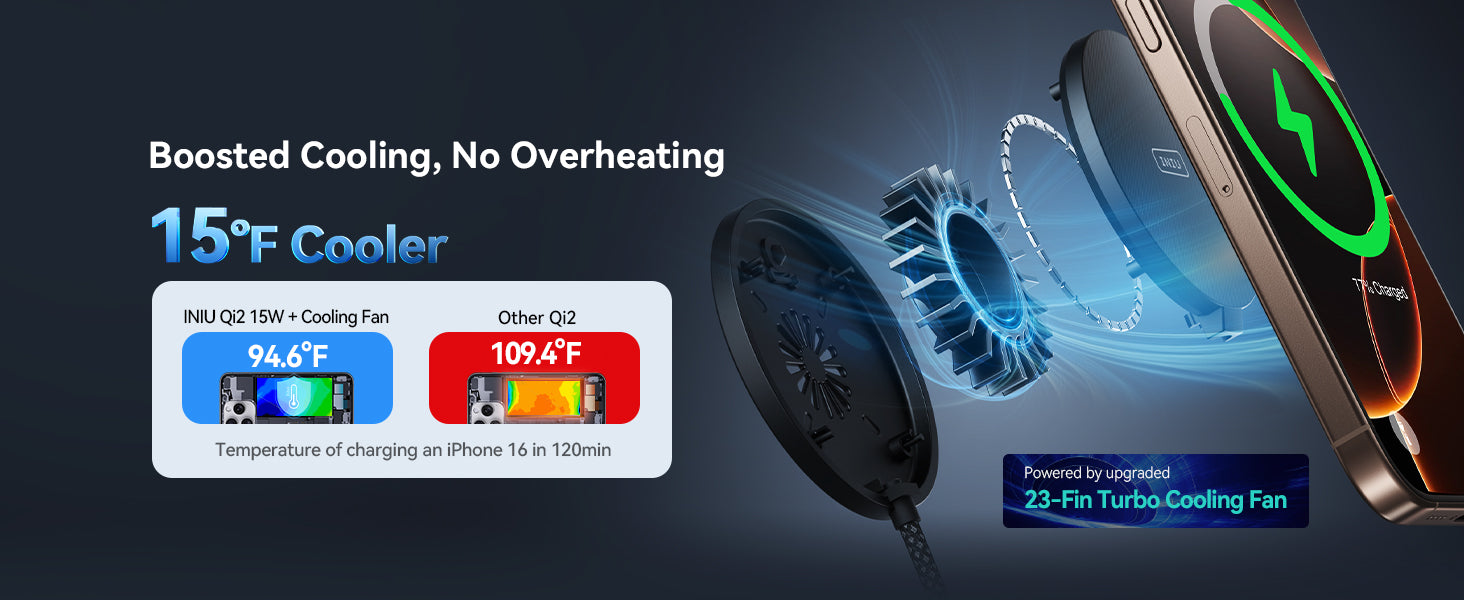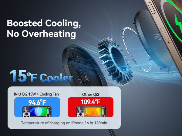- [Ekskluzywna technologia chłodzenia zapobiega uszkodzeniom baterii] Dzięki ulepszonemu 23-żebrowemu wentylatorowi chłodzącemu ta magnetyczna ładowarka bezprzewodowa zapewnia o 15°F (8,2°F) niższą temperaturę i szybsze ładowanie, chroniąc baterię Twojego iPhone'a przed uszkodzeniem w wyniku przegrzania.
