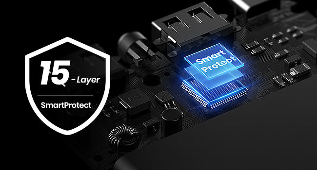 15-Layer SmartProtect shrugs off 15 possible charging risks: farewell overheating and device damage.