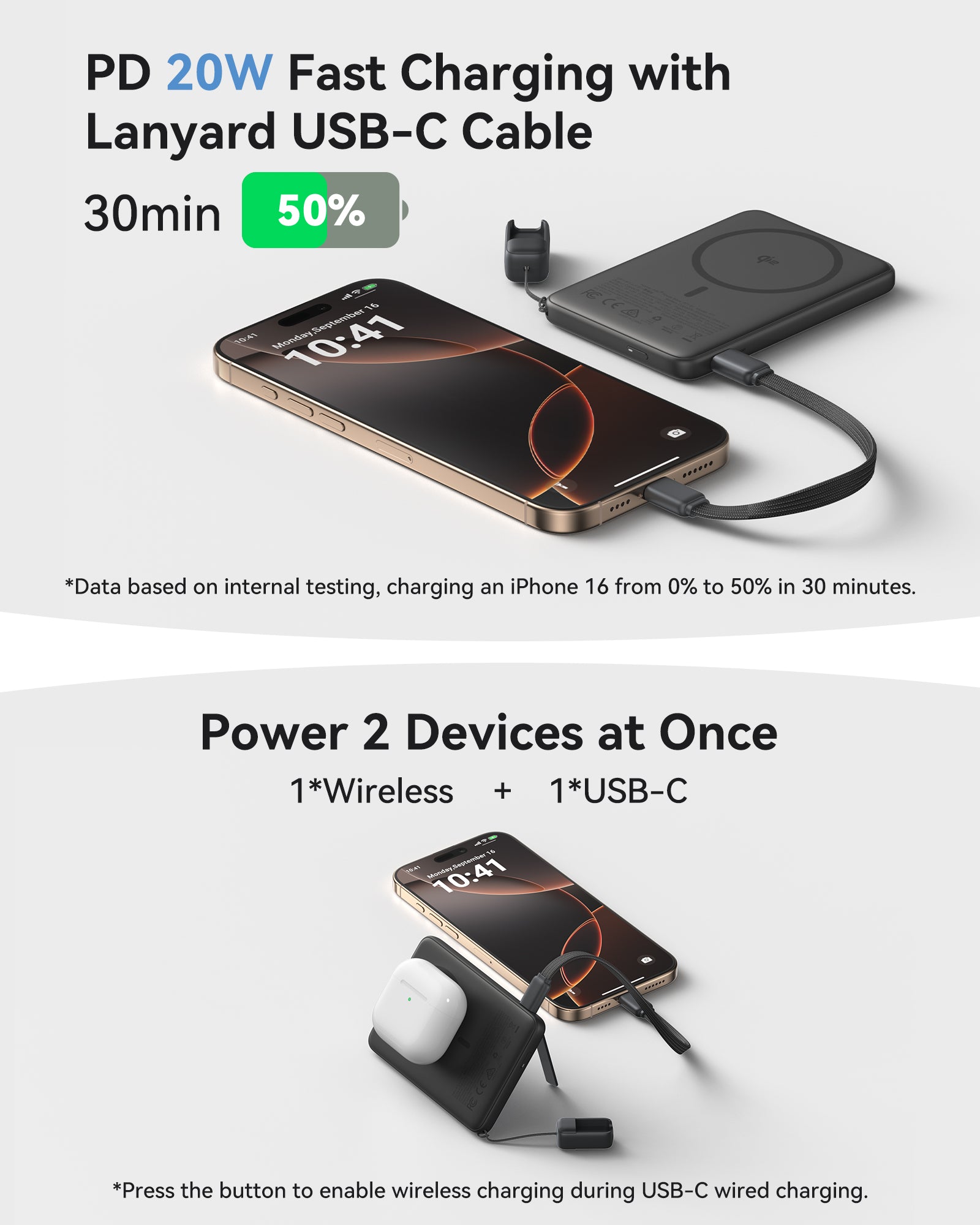Quickly boost your phone using the included lanyard USB-C cable and a 20W or higher adapter (not included).