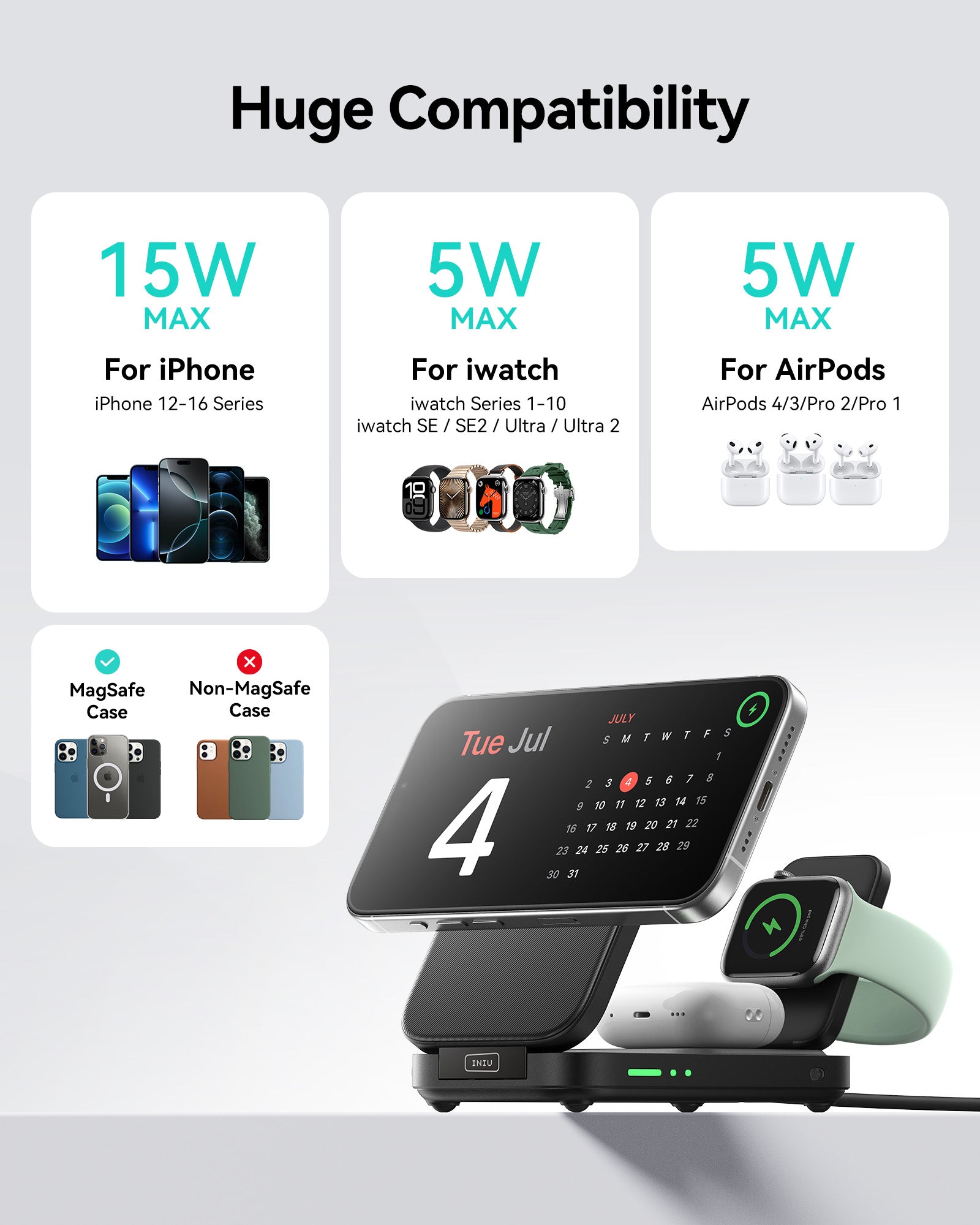 15W (telefon) / 5W (AirPods) / 5W (iwatch)