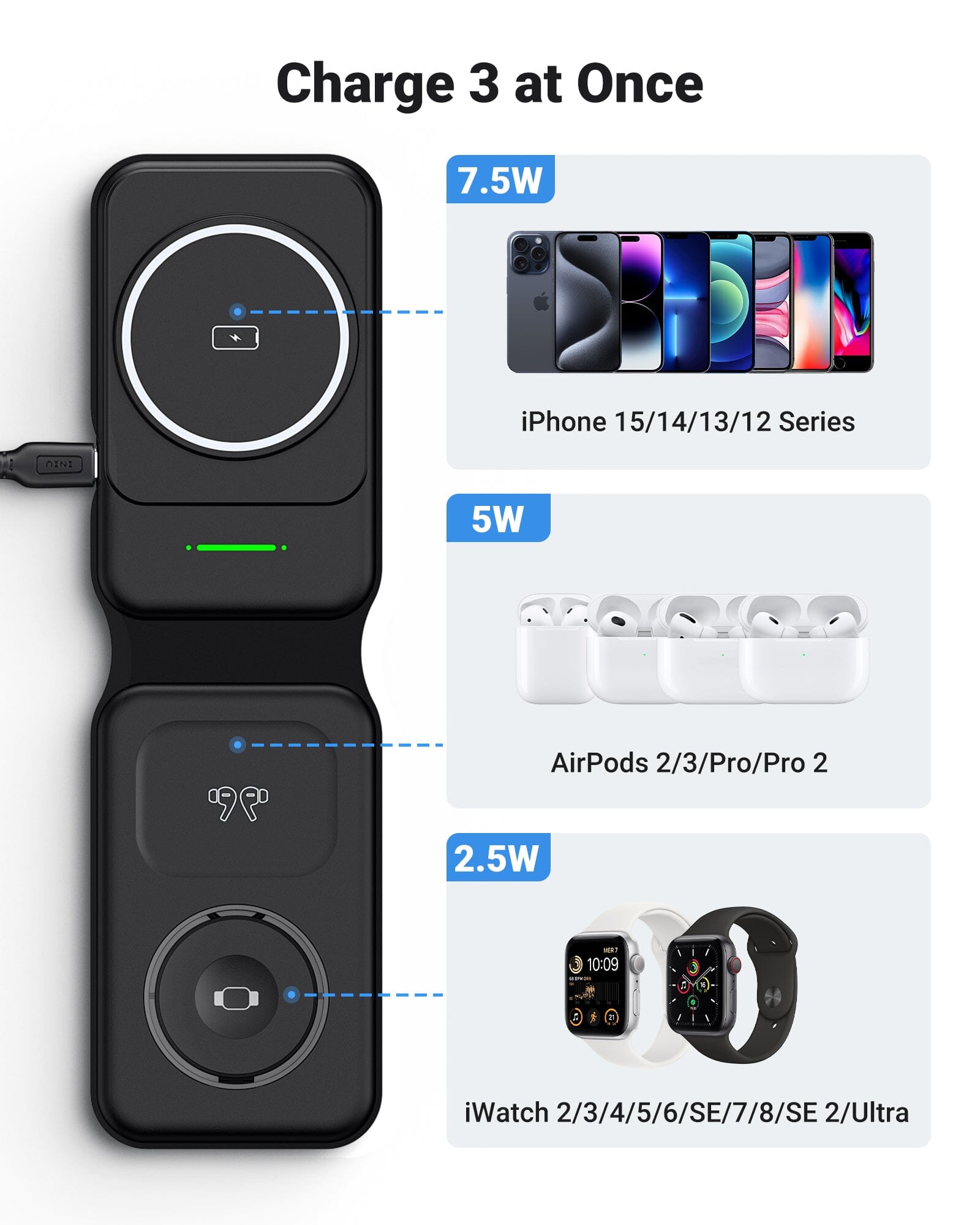 INIU SnapGo WI222 3-i-1 trådlös laddningsplatta och stativ, 15W magnetisk multifunktion